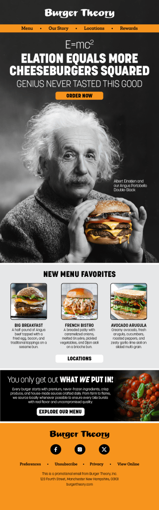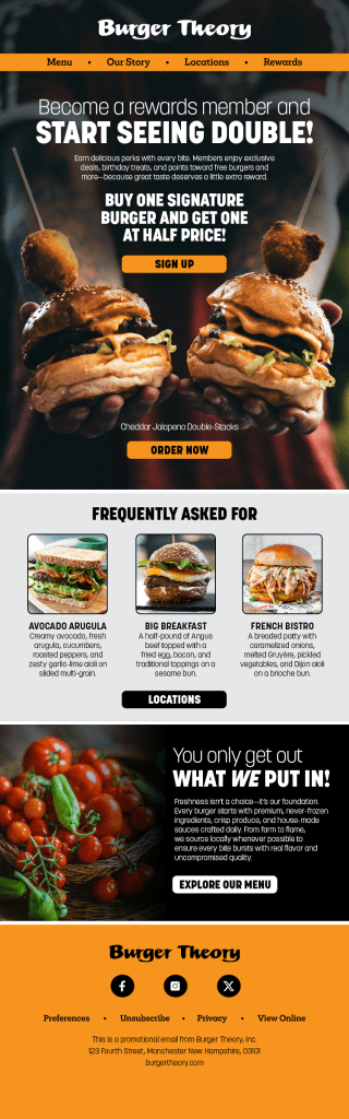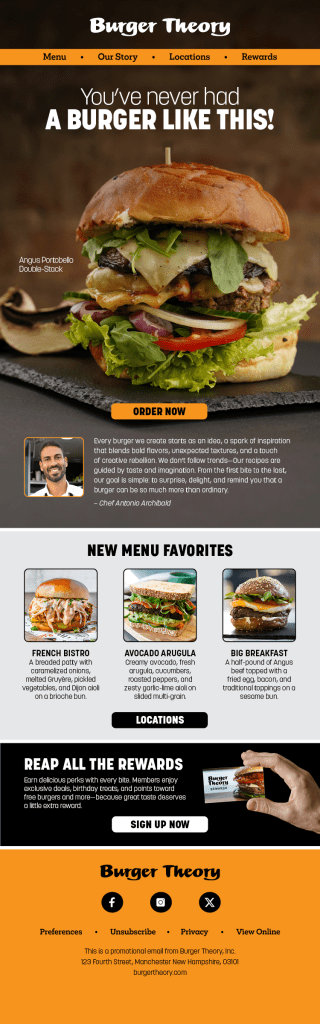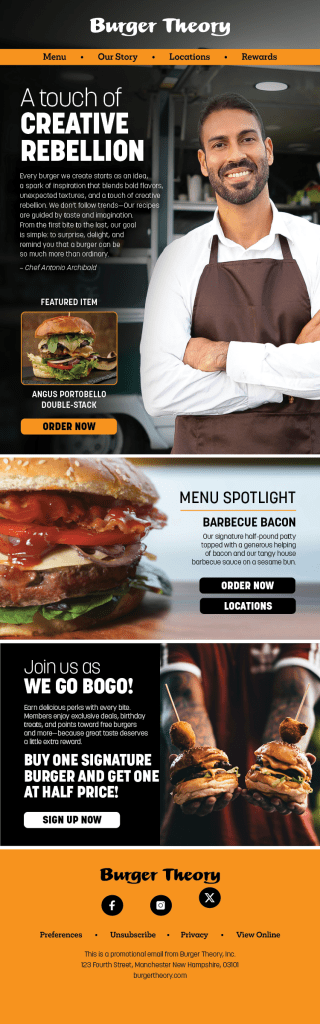 To meet Burger Theory’s growing needs, I developed a comprehensive brand and marketing system grounded in clear messaging pillars: bold, inventive menu offerings, crave-worthy flavor variety, a loyalty-driven rewards program, and the approachable charisma of its local owner-operator. I established a consistent visual style, sourced vibrant, appetite-inducing photography, and crafted a distinct, witty brand voice. Together, these elements elevated Burger Theory’s identity, strengthened recognition, and positioned the restaurant as a standout regional favorite.