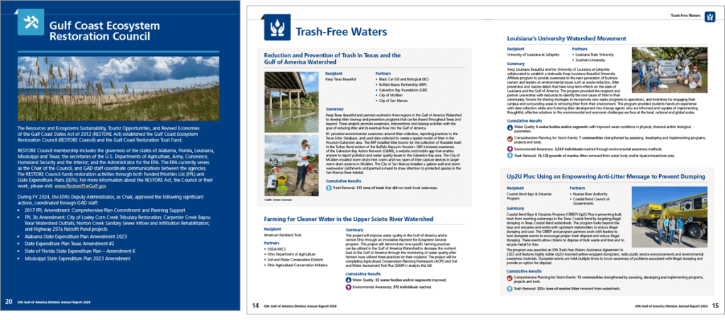 The Gulf of Mexico Division (GMD) is one of the EPA’s Great Water Body Programs whose geographic focus is on the major environmental issues of the Gulf of Mexico region and its watershed. GMD works with each of the five U.S. Gulf Coast states and other stakeholders (including the six Mexican Gulf Coast states) on projects that support priority areas such as water quality, community resilience, environmental awareness, and habitat restoration.