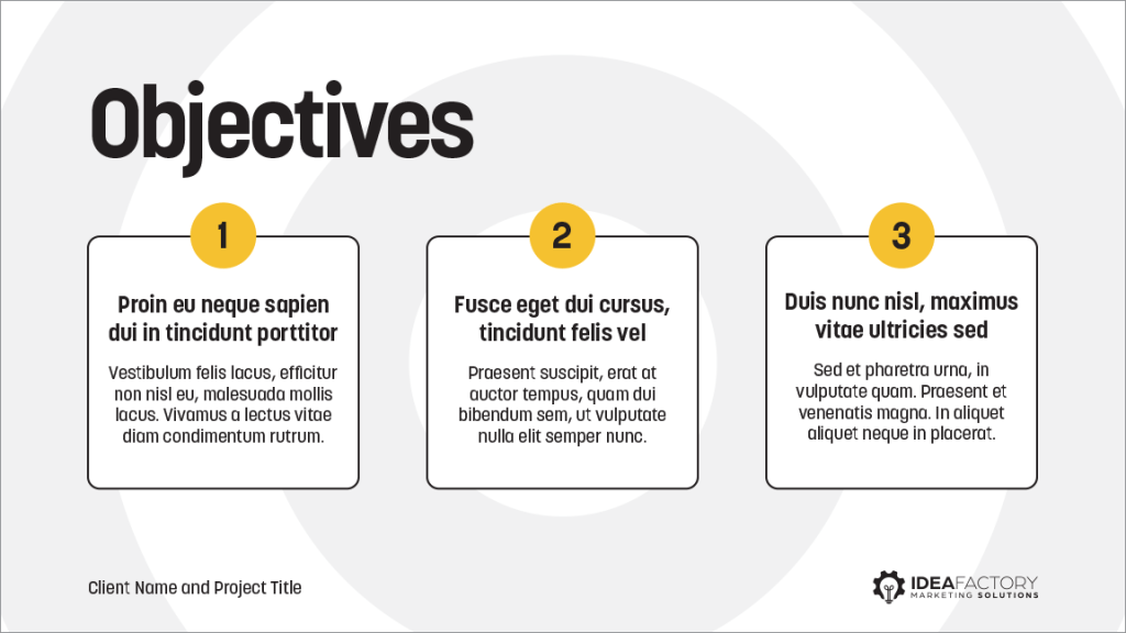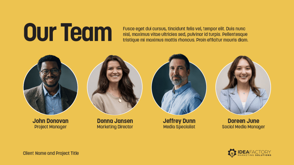 I designed slide templates tailored to IdeaFactory’s branding and workflow needs. I created options for both Google Slides and PowerPoint, accounting for each platform’s specific capabilities while ensuring maximum flexibility. The templates provided ready-to-use, aesthetically pleasing layouts that were easy for both designers and non-designers to work with, allowing them to create polished presentations without overthinking design decisions.