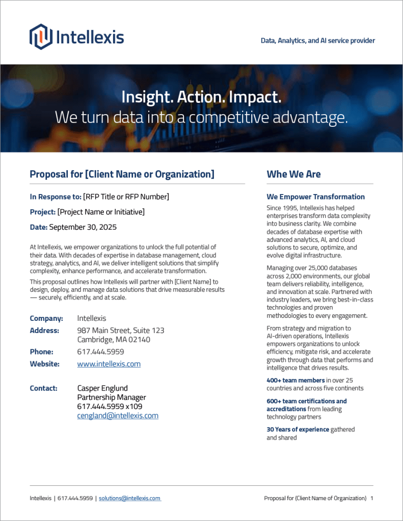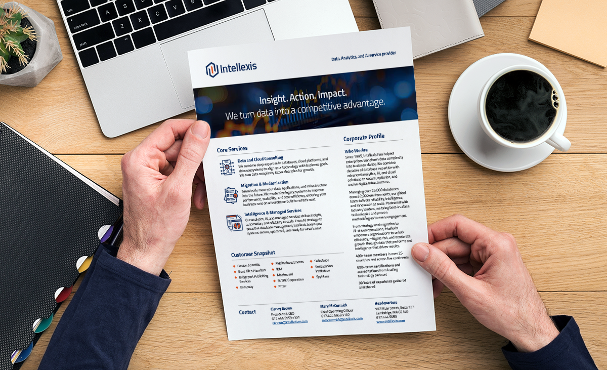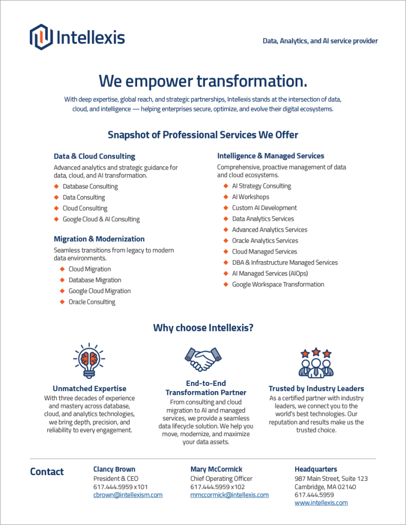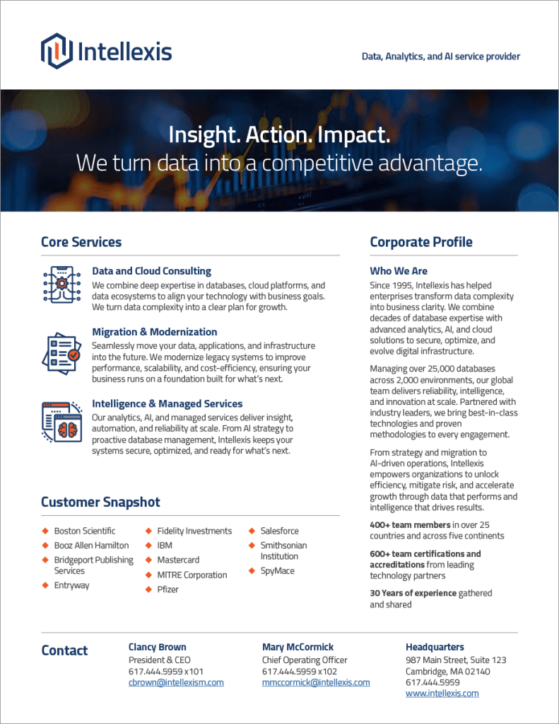 Intellexis is a data, analytics, and AI service provider that has helped enterprises transform data complexity into business clarity since 1995. They combine decades of database expertise with advanced analytics, AI, and cloud solutions to secure, optimize, and evolve digital infrastructure. Managing over 25,000 databases across 2,000 environments, their global team delivers reliability, intelligence, and innovation at scale. Backed by partnerships with industry leaders, Intellexis empowers organizations to unlock efficiency, mitigate risk, and accelerate growth.