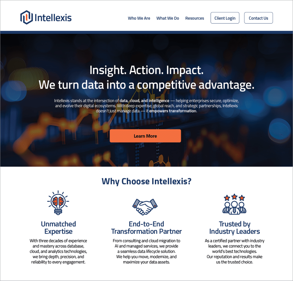 I led a comprehensive branding and marketing refresh to reposition Intellexis as a modern, capable, and trustworthy partner. My goal was to unify the brand across all touch-points and create compelling, practical tools to support customer acquisition.